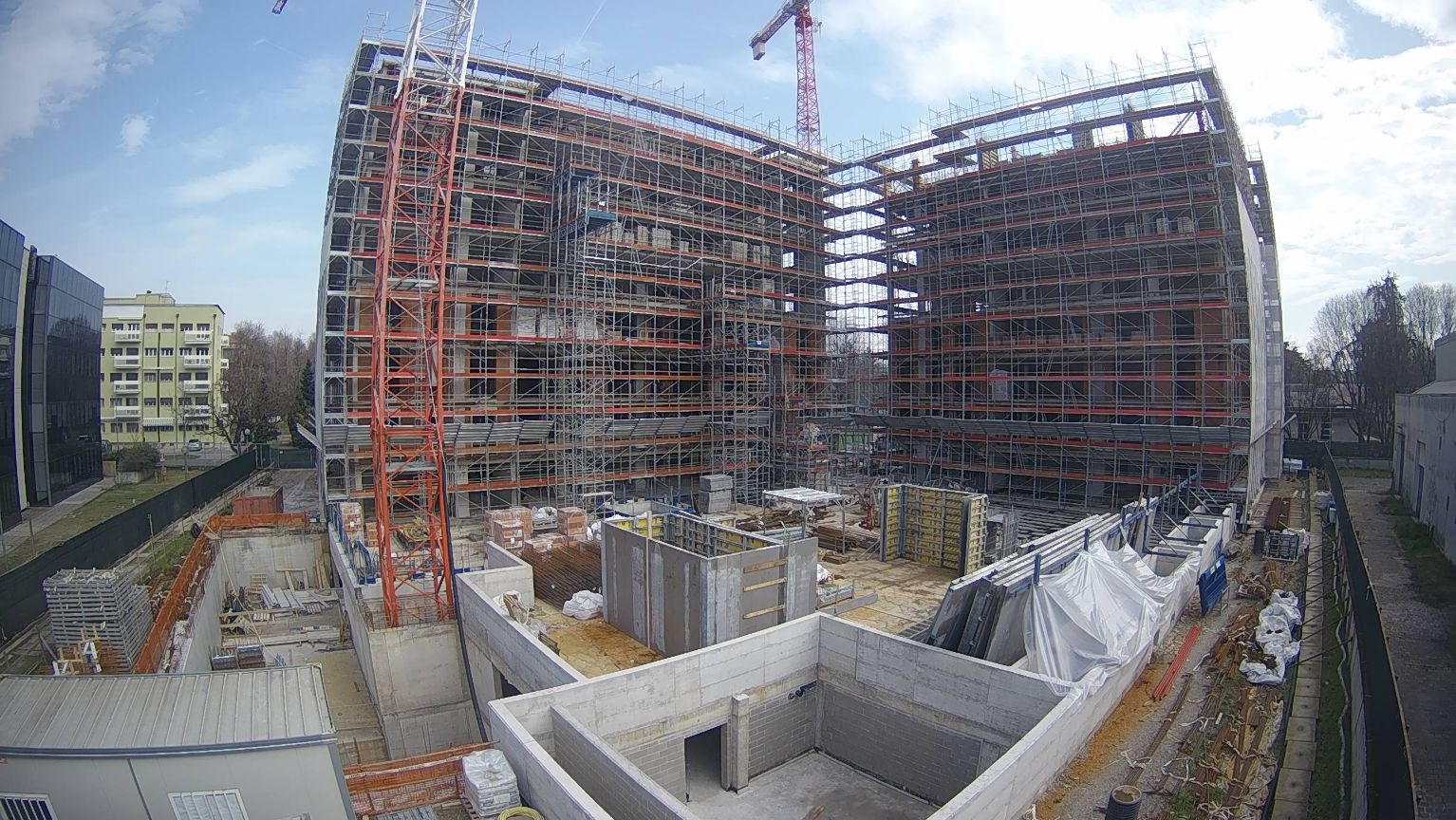 È stato completato il solaio del sesto piano dell’edificio 1 ed è in fase di realizzazione il solaio del sesto piano dell’edificio 2. È iniziata la posa delle murature esterne ed interne.